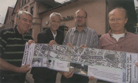 »Dr. Lippenkraft« bot besten Jazz, auf dem Grill schmorten leckere Nackensteaks und Würstchen. Kühle Getränke wurden ebenfalls gereicht beim »Pro Lutter Benefiz- Jazzfrühschoppen« am Sonntag in der »Hammer Mühle«. »Wir wollen, dass hier bald wieder ein Bach fließt«, begründete Wirt Uwe Modest, warum er die Aktion startete, deren Reinerlös dem Verein »Pro Lutter« zugute kommen soll. Der Verein macht sich für die Freilegung des Fließgewässers in der Innenstadt stark, hat am Gymnasium am Waldhof schon bewiesen, dass dies eine Bereicherung fürs Stadtbild ist. Über das weitere Vorgehen informierten (v.l.) Günter Wesch, Wasserbauingenieur Detlef Sönnichsen, Prof. Andreas Beaugrand und Martin Enderle. MiS/Foto: Büscher